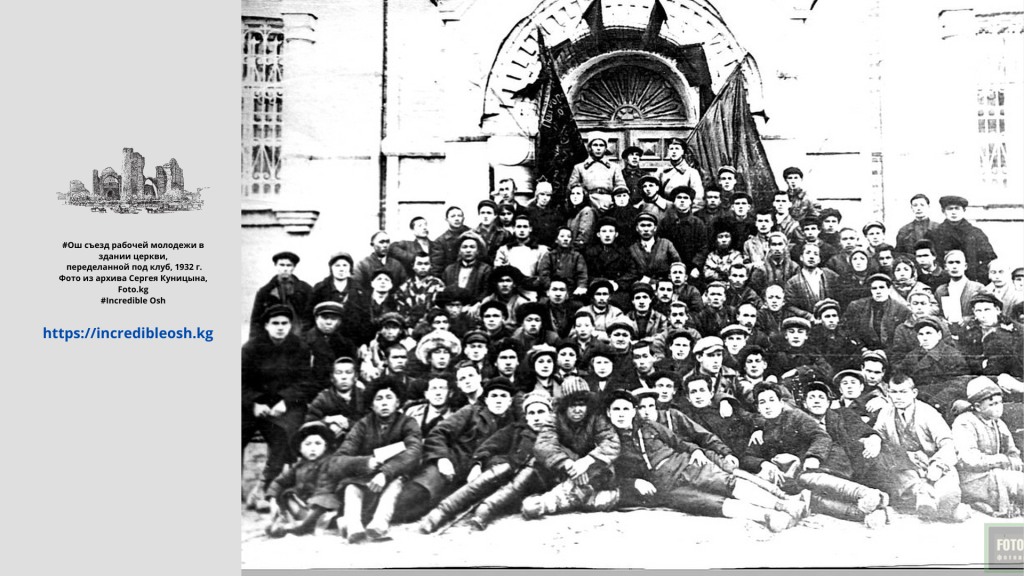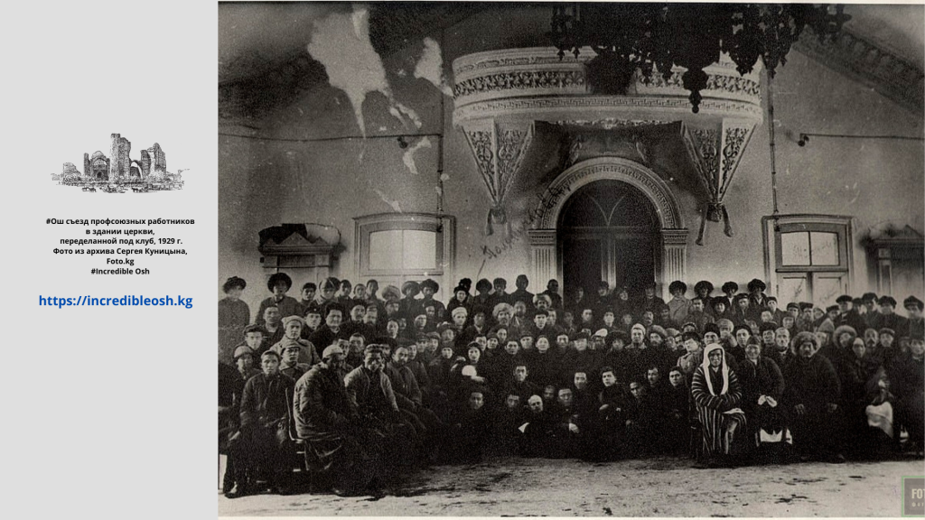 В 1928 году 10 декабря Ошский исполнительный комитет принимает постановление «Об использовании помещения церкви под клуб». В котором говорится, что решение было такое решение было принято учитывая: “а) мнение подавляющего большинства русского населения города Ош о необходимости закрыть церковь и использовать помещение под клуб; б) невыполнение договора религиозной общины, неуплата налогов и сборов в течение 4-х лет”. Были сброшены колокола и кресты, сломали купол, разрушили колокольню, уничтожили иконостас и алтарь.